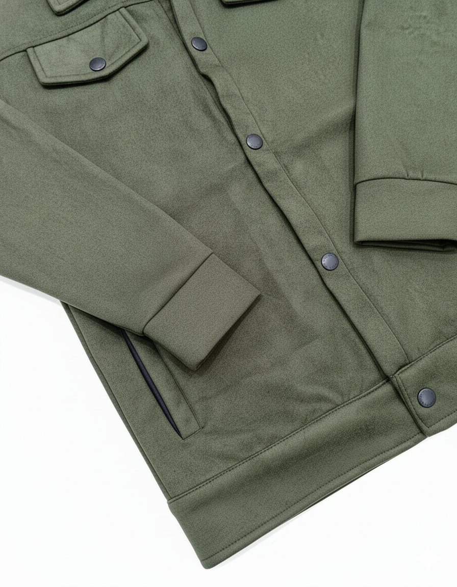 Bring a touch of rugged elegance to your wardrobe with our Olive Green Scuba Jacket. Designed for the modern man, this jacket features a rich, earthy tone that pairs perfectly with denim or chinos. Crafted from high-quality, soft-touch scuba fabric, it offers the structured look of a coat with the comfort of a sweatshirt. The classic spread collar and button-down front provide a versatile look suitable for both office casual and weekend adventures.